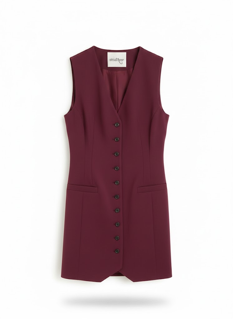 Abito gilet dal taglio sartoriale, pensato per valorizzare la silhouette con linee pulite ed essenziali. Il design senza maniche presenta uno scollo a V, chiusura frontale con bottoni e tasche a filetto che richiamano l’eleganza del tailoring maschile reinterpretato in chiave femminile.