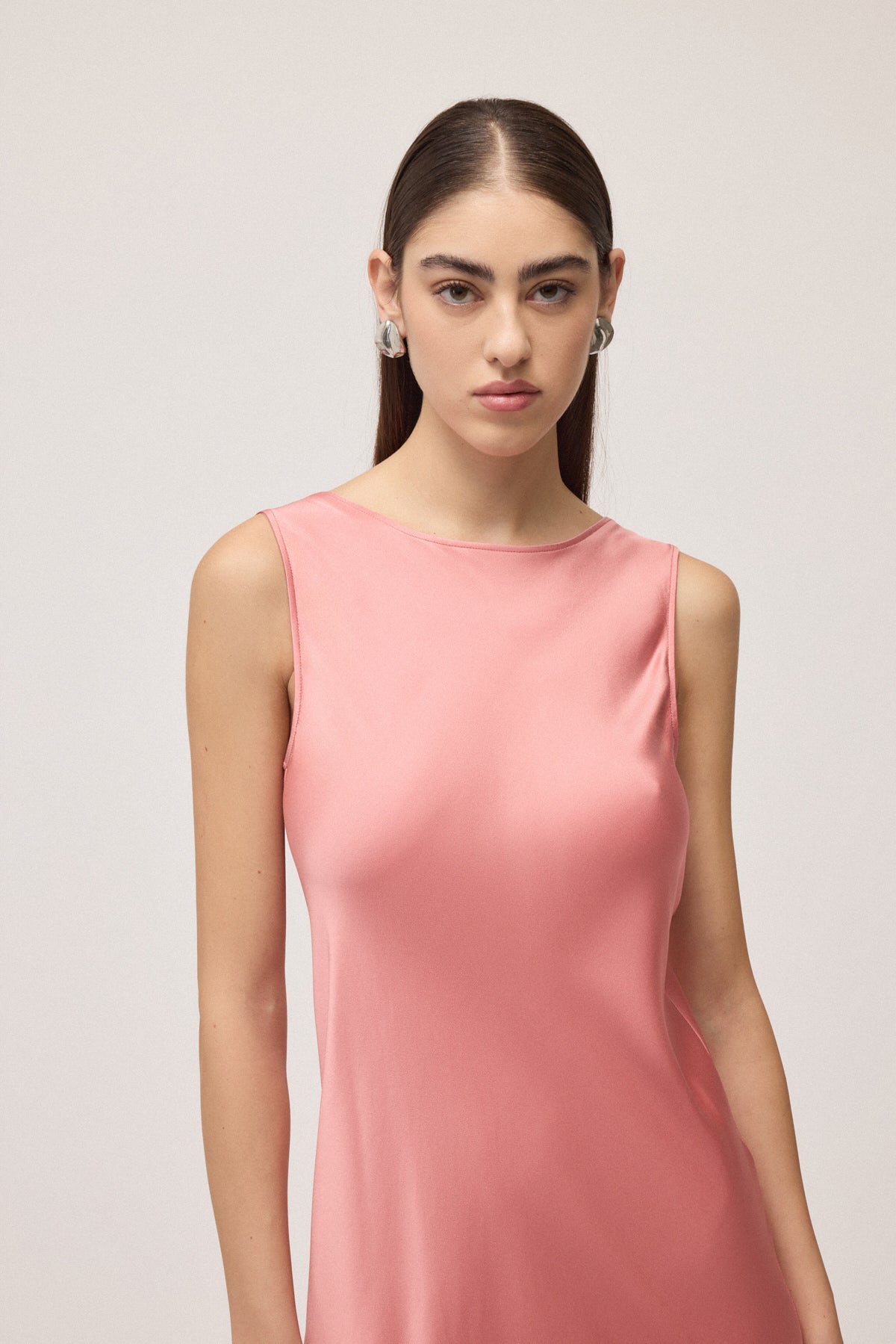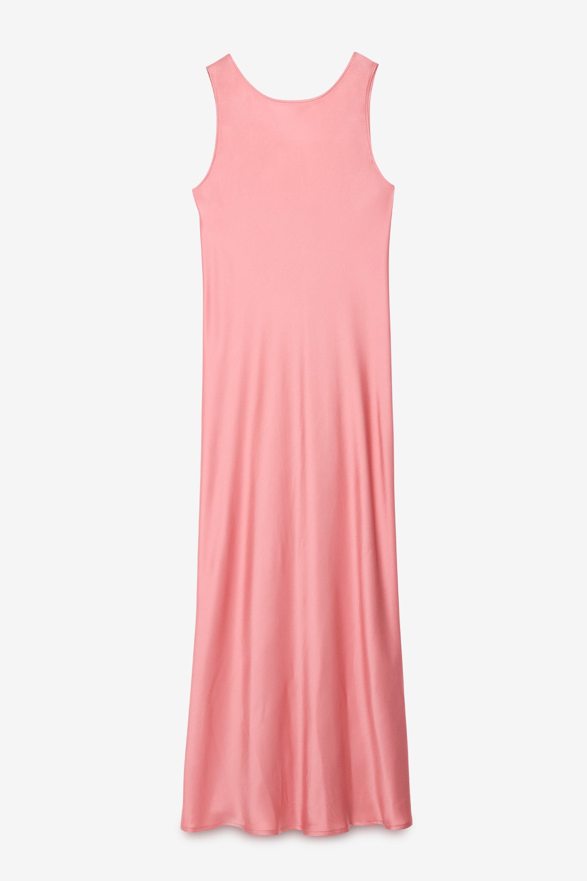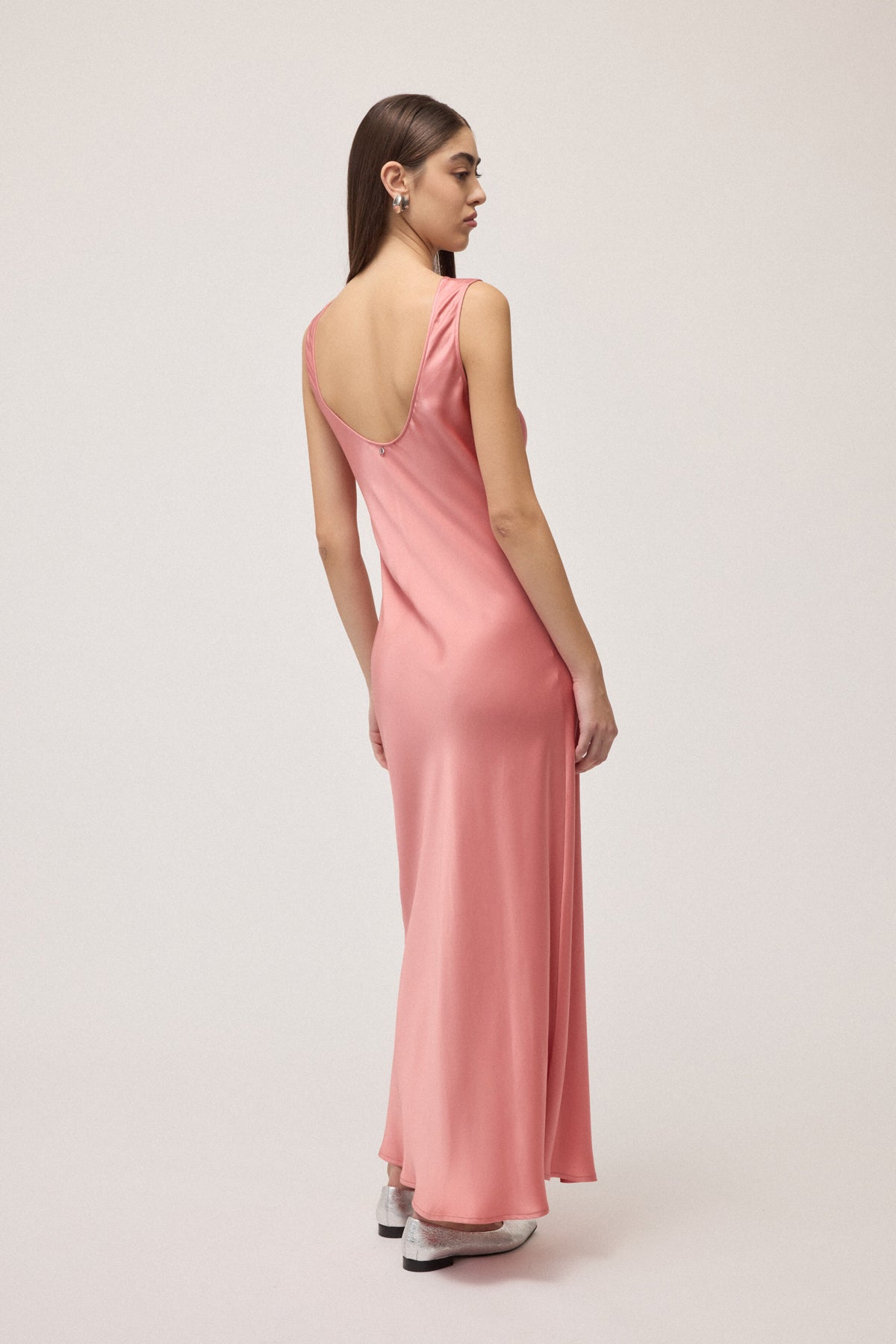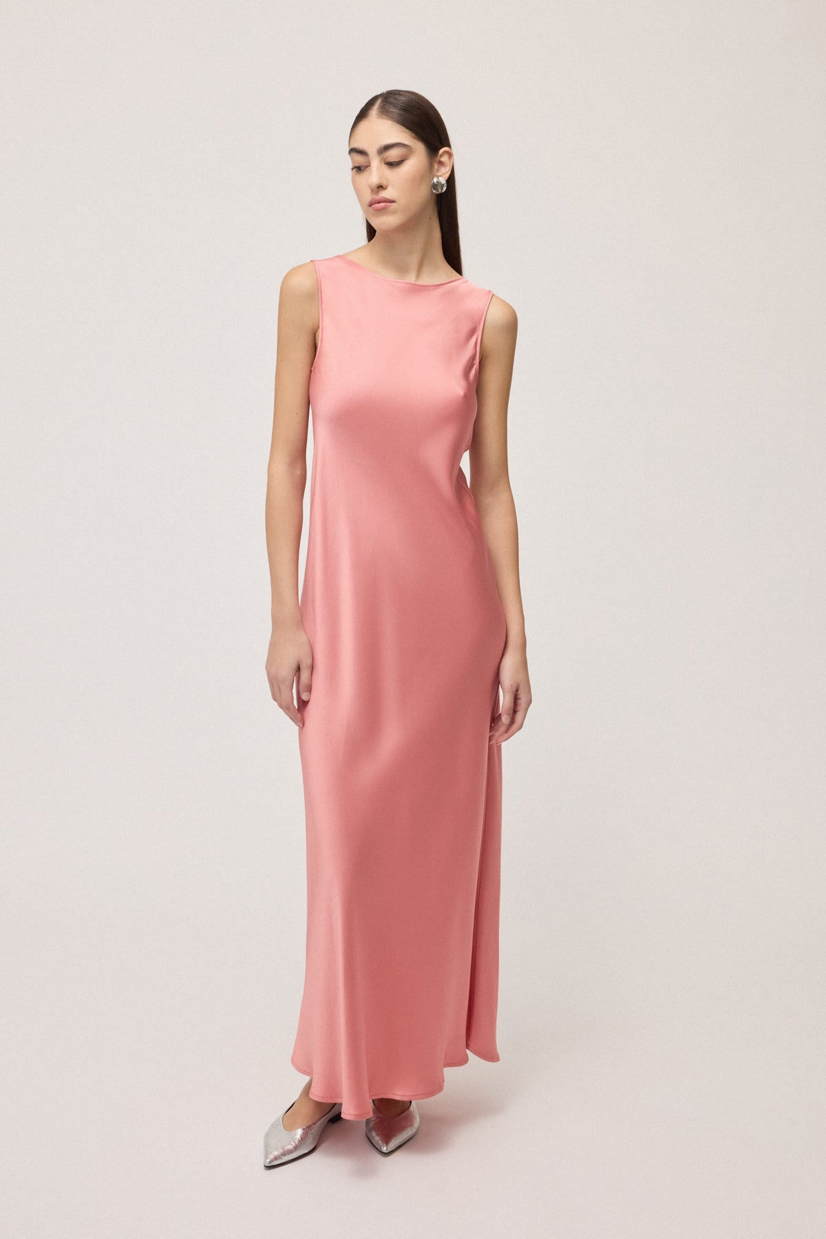 Abito lungo smanicato in viscosa caratterizzato da scollo profondo sulla schiena e linea fluida.