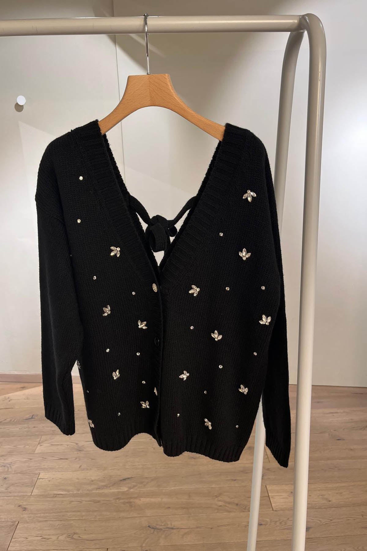 Cardigan nero in maglia con scollo a V, arricchito da applicazioni decorative luminose e dettaglio laccio sul retro. La linea femminile e raffinata lo rende ideale per completare look eleganti o casual chic. Firmato Vicolo.