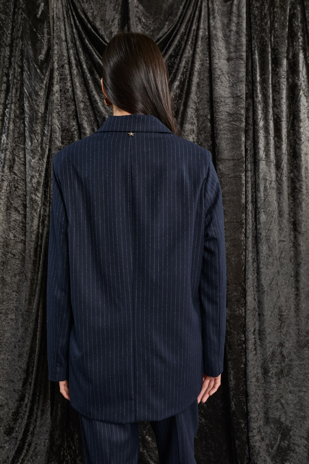 Giacca blu dal design essenziale: reinterpretazione contemporanea con attenzione ai dettagli e alla qualità.