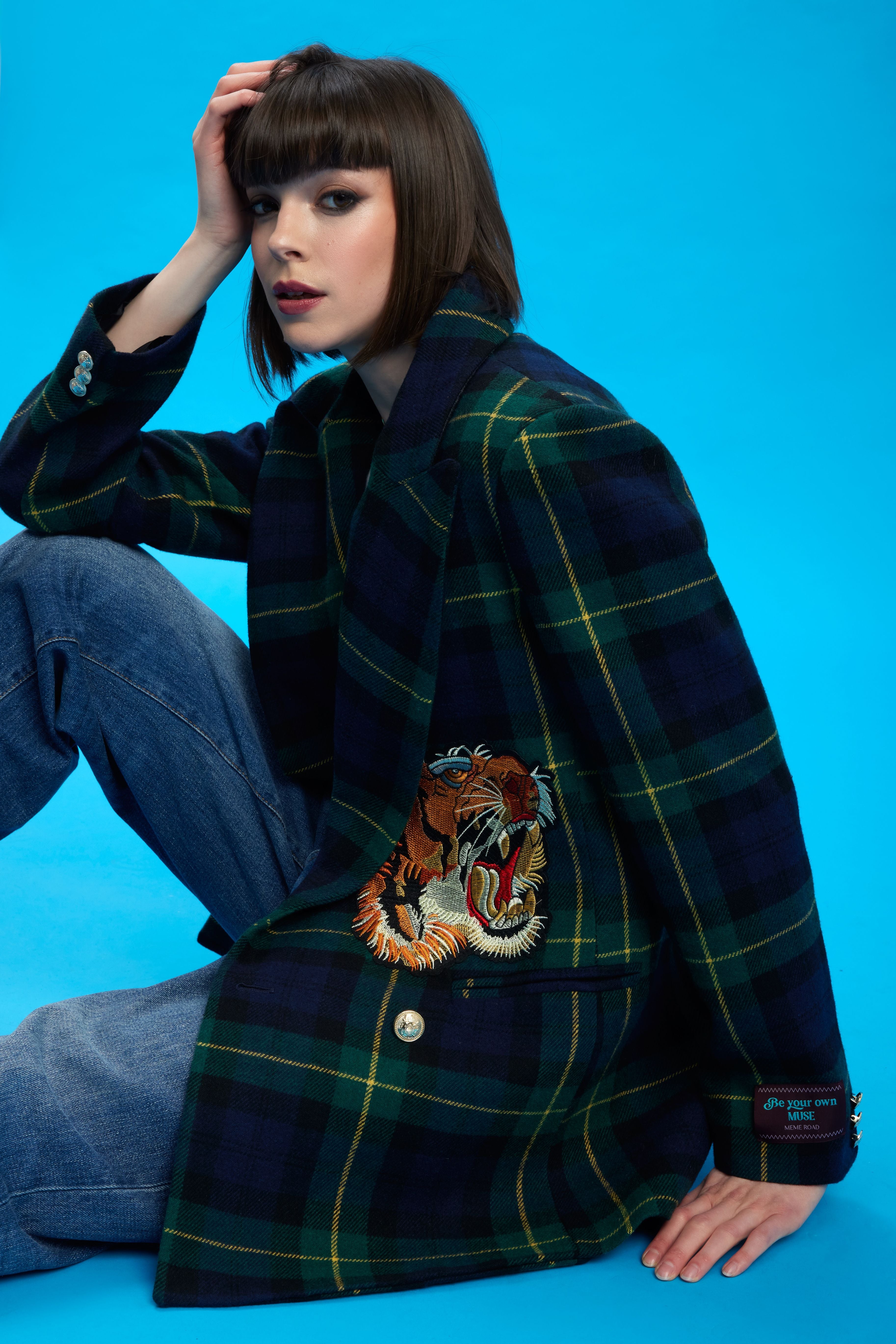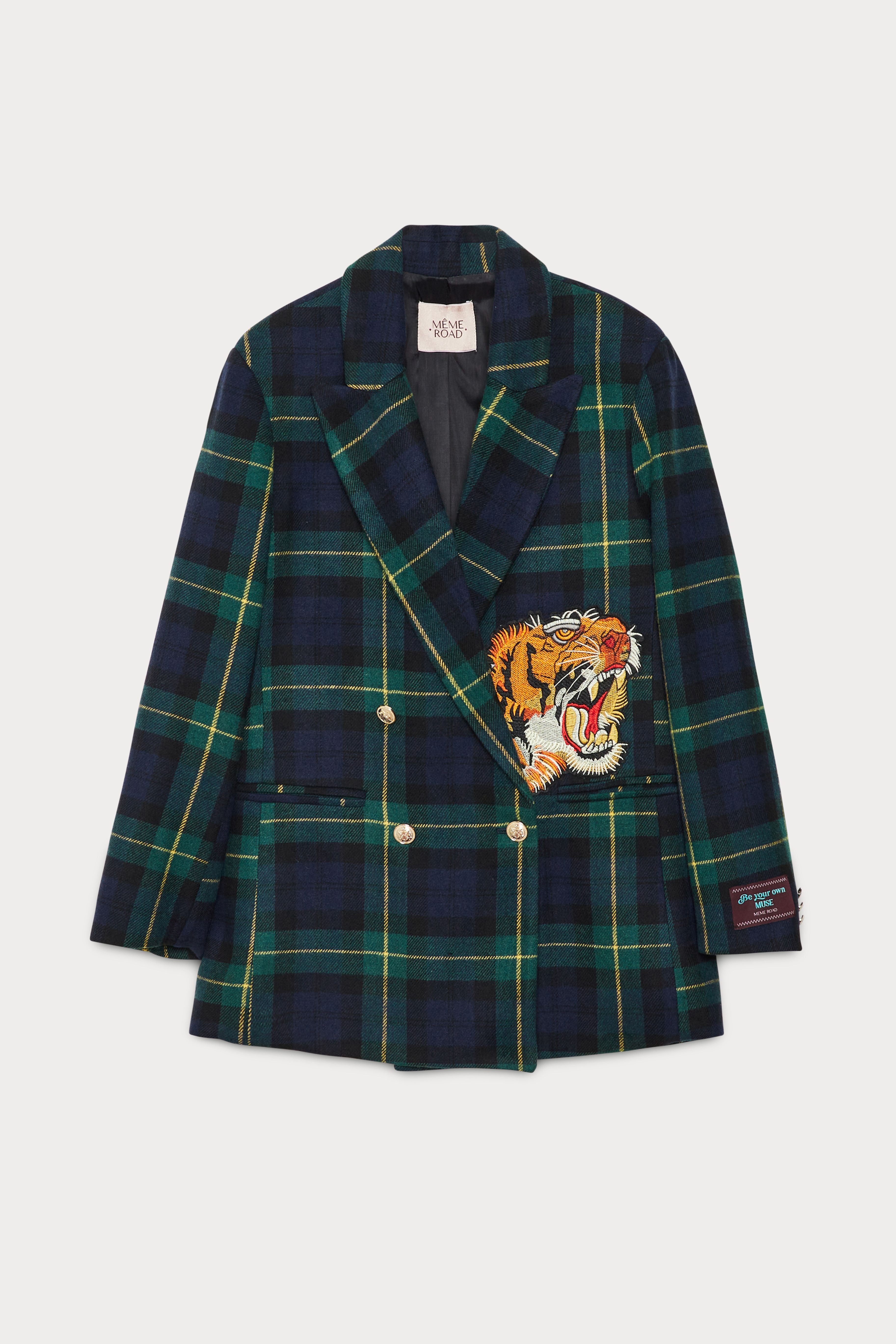 Giacca doppiopetto in tessuto tartan con patch a forma di tigre