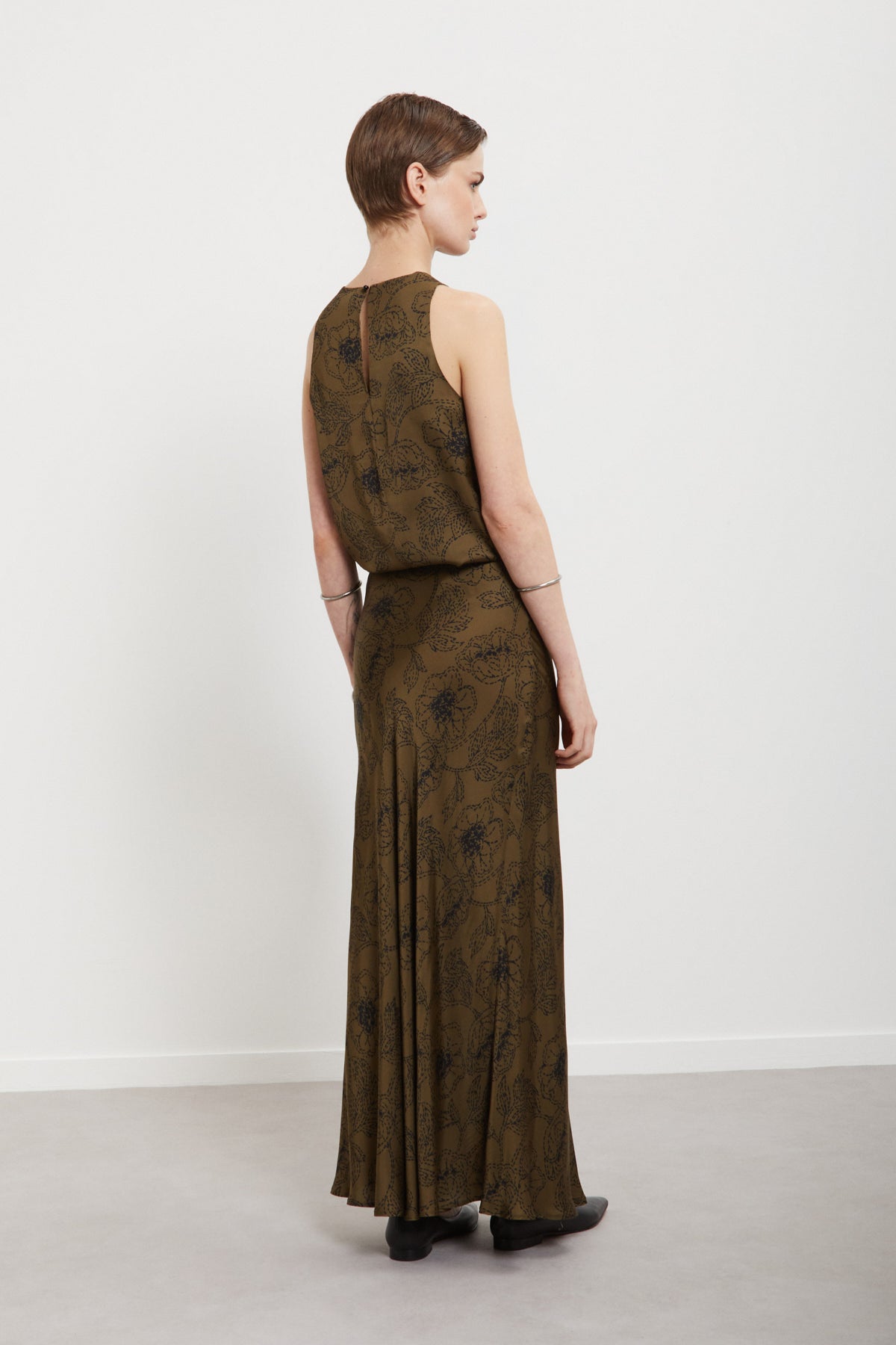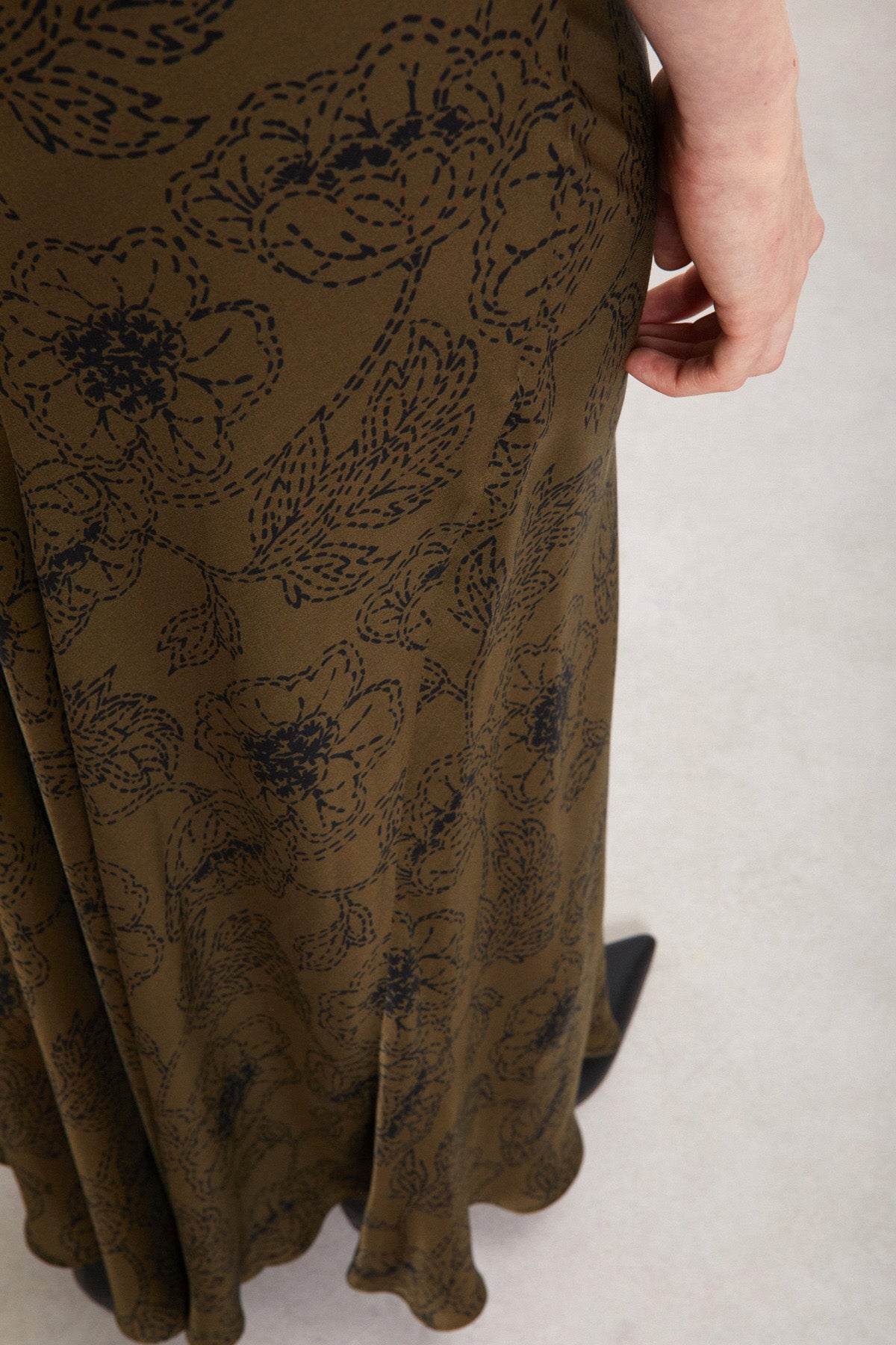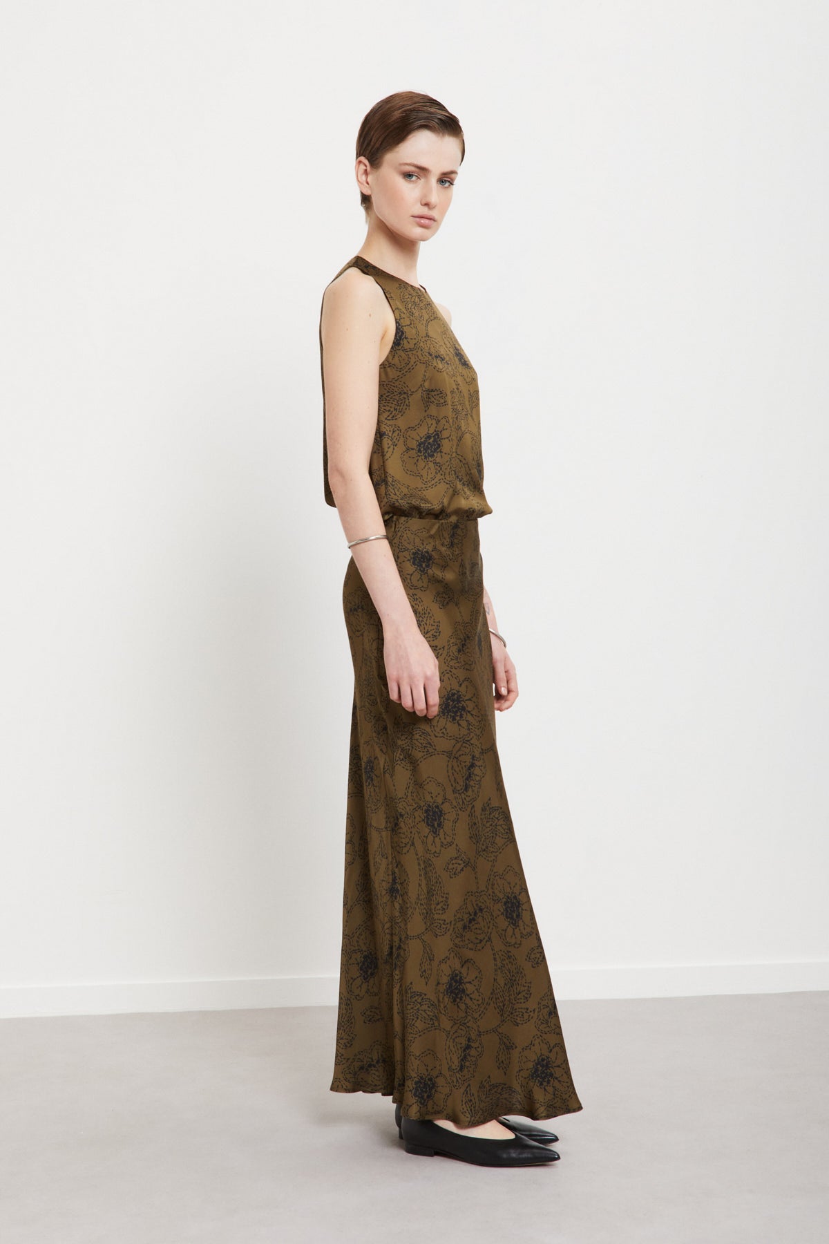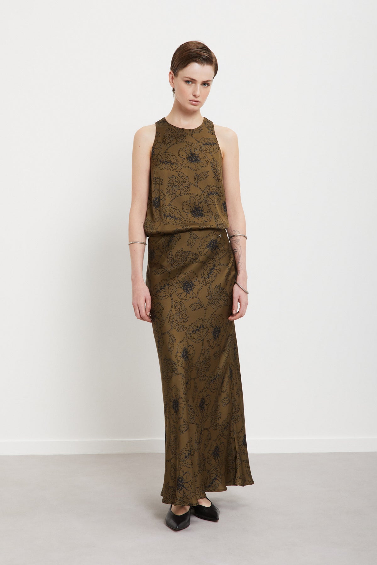 Dettagli attuali e finiture ben bilanciate completano il design. Gonna lunga in pura viscosa stampata con pinces.