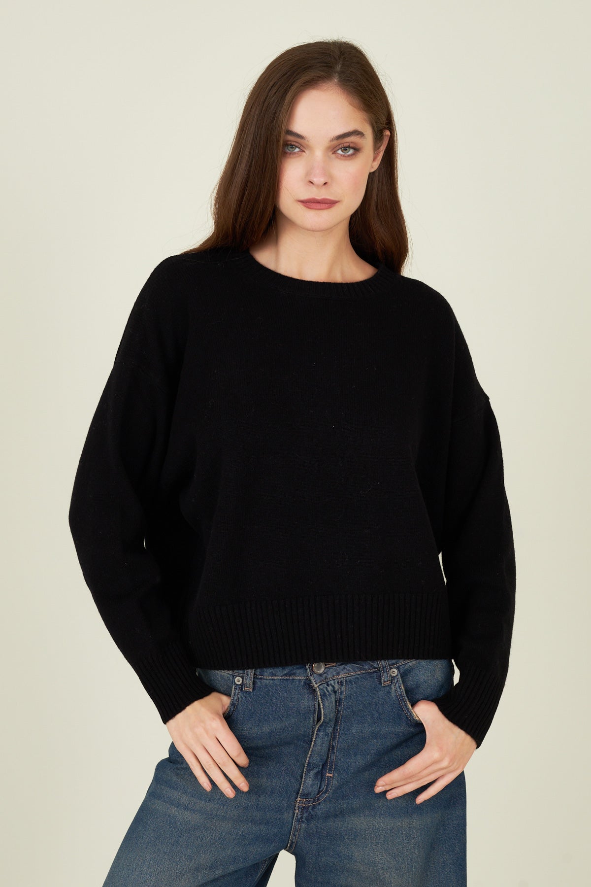 Essenziale ma ricercata, questa maglia in maglia rasata nera è un capo passe-partout del guardaroba quotidiano. La linea pulita è arricchita da volumi morbidi sulle spalle e sulle maniche, che donano un tocco contemporaneo e femminile.