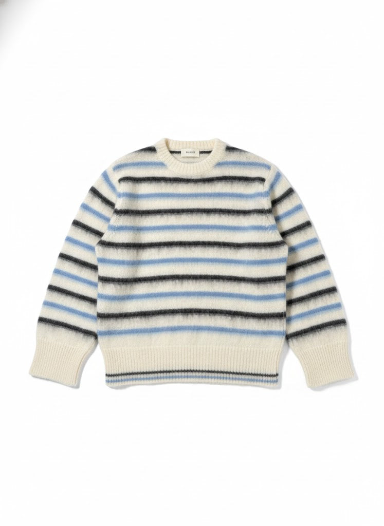 Maglione in maglia morbida caratterizzato da un elegante motivo a righe nei toni neutri e azzurri, pensato per aggiungere luminosità ai look di stagione. Il girocollo classico e le finiture a costine su collo, fondo e polsini garantiscono comfort e una vestibilità equilibrata.