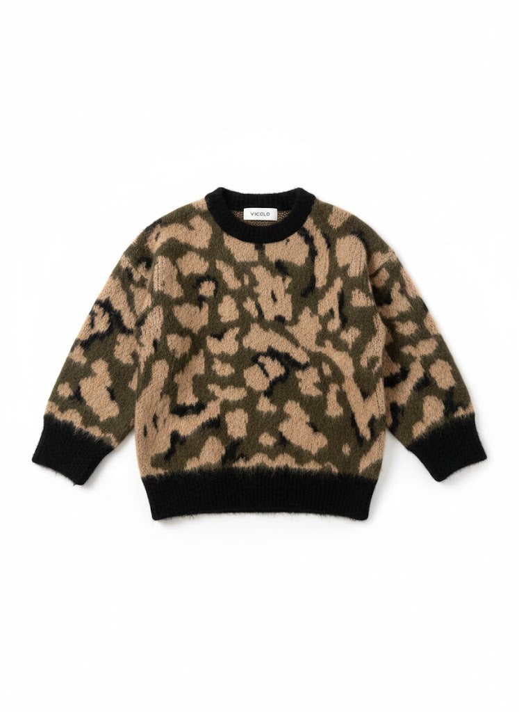 Maglione in maglia jacquard con motivo maculato nei toni naturali, perfetto per aggiungere carattere ai look quotidiani. Il design morbido e confortevole è valorizzato da collo, polsini e fondo a costine in contrasto, che definiscono la silhouette senza rinunciare alla comodità.