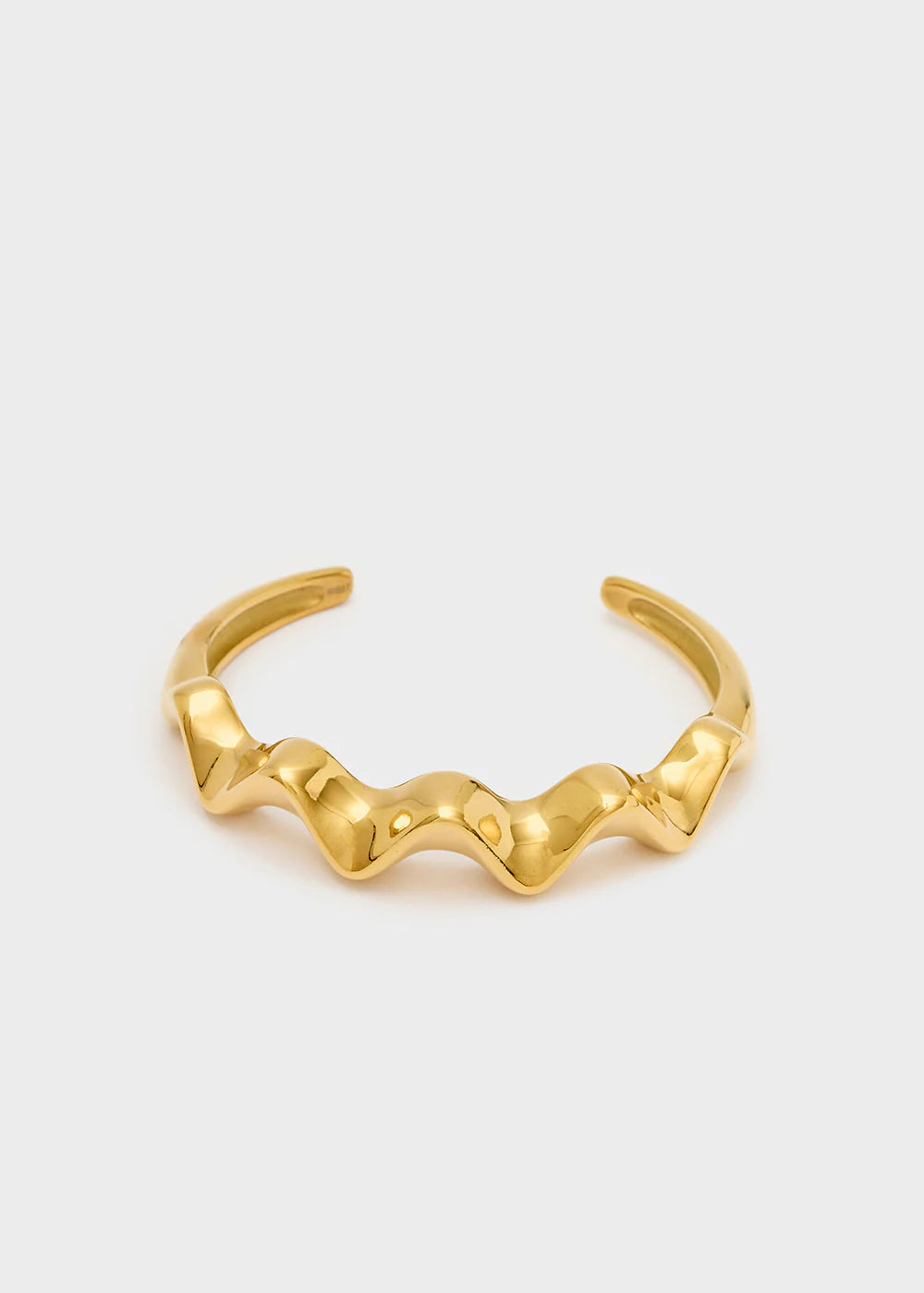 Bracciale rigido dal design scultoreo e fluido, realizzato in metallo dorato lucido. La forma ondulata avvolge il polso con eleganza, creando un effetto grafico e contemporaneo che cattura la luce.