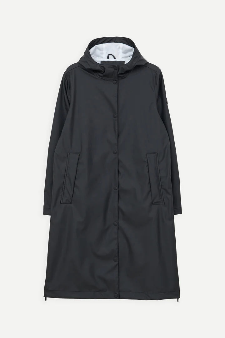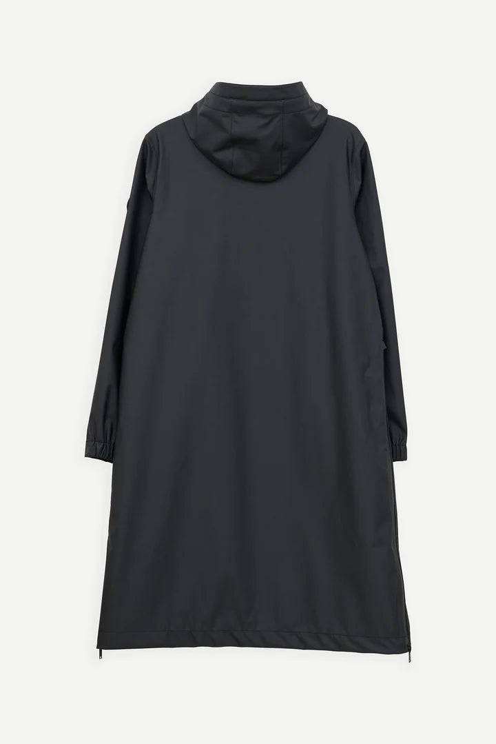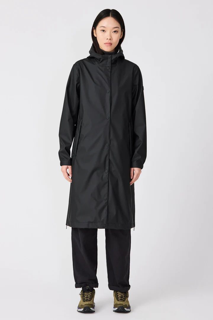 Cappotto lungo realizzato in tessuto tecnico impermeabile, pensato per unire funzionalità e stile essenziale. La silhouette pulita e fluida è valorizzata dalla chiusura frontale con bottoni a pressione nascosti, che mantiene il design sobrio ed elegante.
