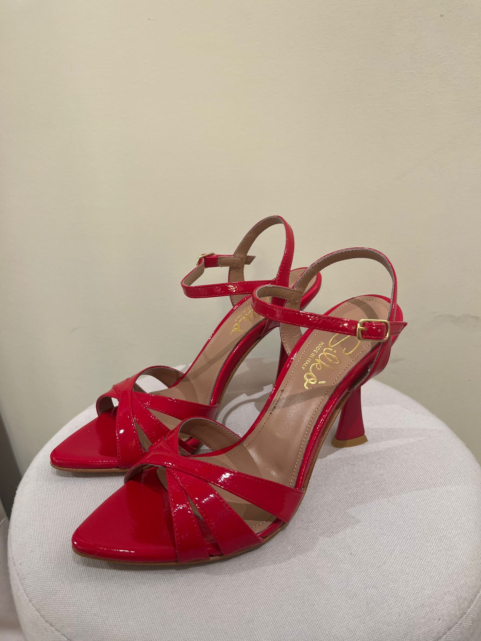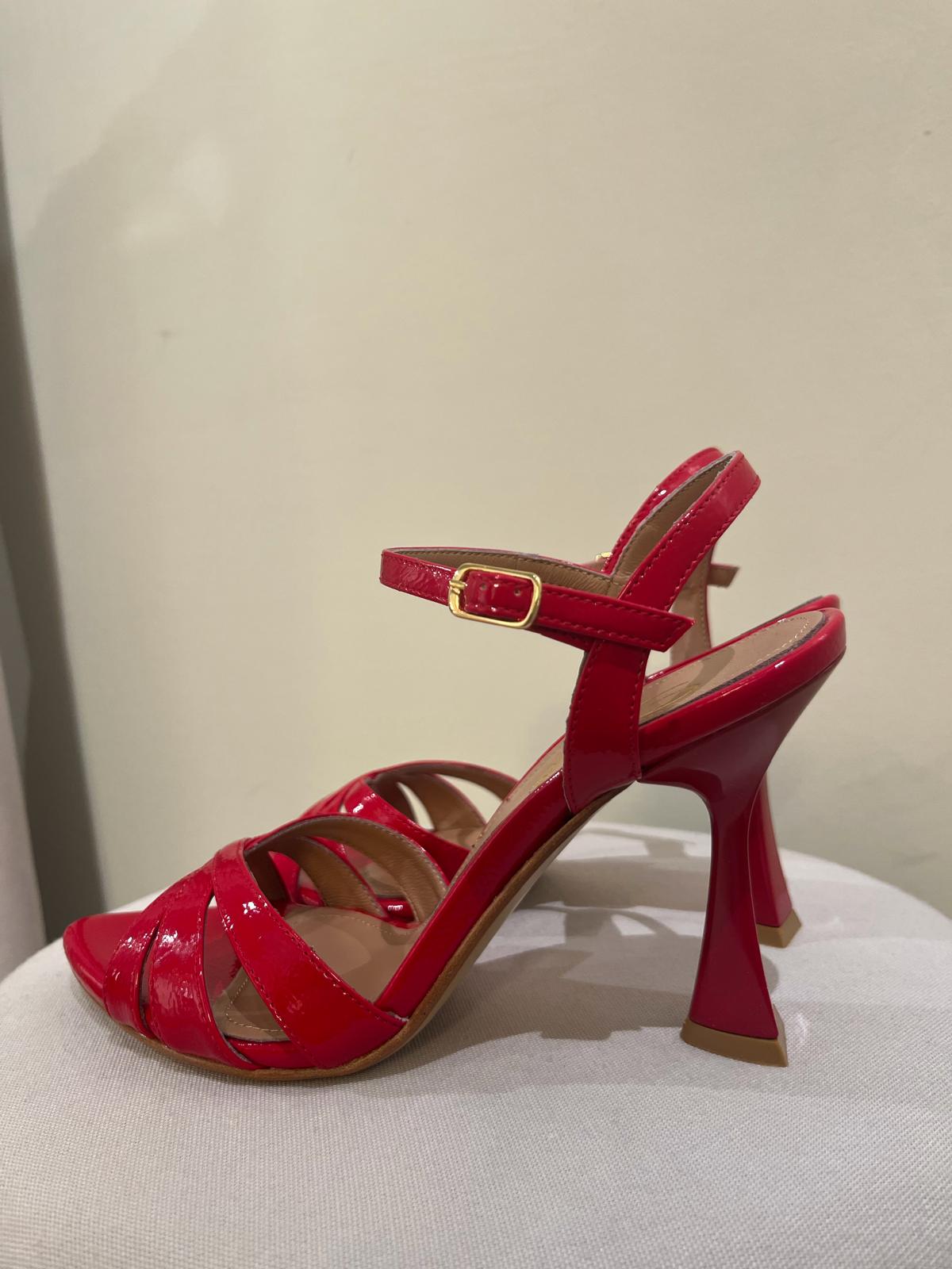 Sandali dal design elegante e femminile, realizzati in vernice lucida nella vivace tonalità rosso intenso. Le fasce sottili intrecciate sul davanti valorizzano il piede con un effetto raffinato e moderno, mentre il cinturino alla caviglia con fibbia assicura stabilità e comfort.
