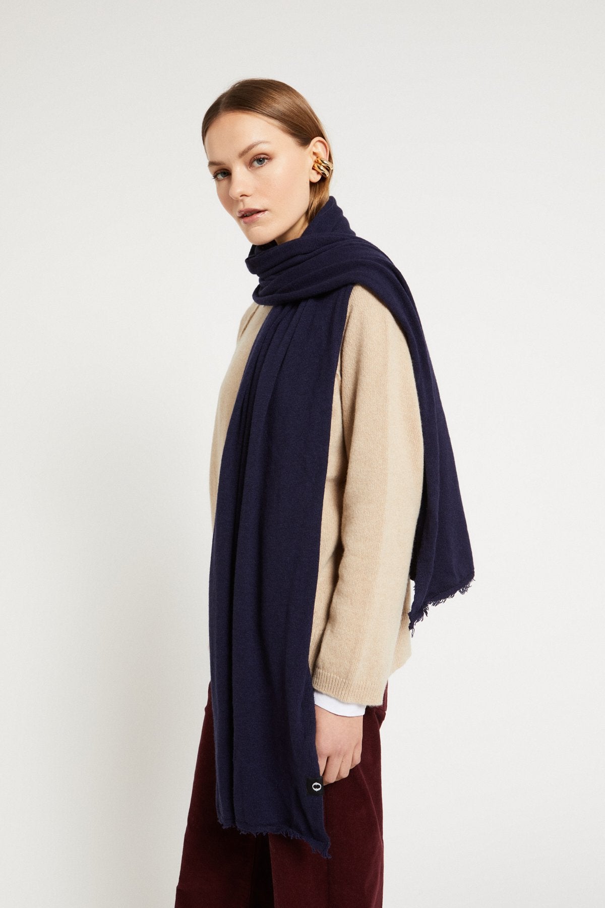 Sciarpa realizzata in maglia morbida e avvolgente, caratterizzata da una delicata sfumatura cromatica che dona profondità e raffinatezza al design. Le estremità con finitura leggermente sfrangiata aggiungono un tocco naturale e contemporaneo.